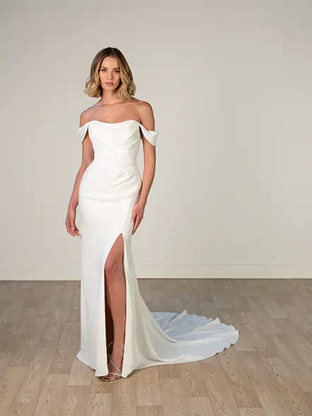 Exuding modern sophistication, this luxe crepe wedding dress embraces a figure-flattering column silhouette that’s both timeless and on-trend. Una features a stunning draped bodice with an elegant scooped neckline as detachable off-the-shoulder straps add a touch of effortless sexiness and glamour. The sumptuous crepe fabric drapes beautifully over every curve as an optional leg slit offers an extra dash of charm for the daring bride. With its clean lines and modern design, this off-the-shoulder wedding gown is an ideal fit for the fashion-forward bride looking for an undeniably chic and irresistibly romantic bridal look. This wedding gown is also available in plus sizes.